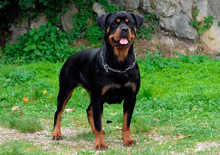 La fuerza del Rottweiler se aprecia en su cuerpo poderoso y en sus potentes mandíbulas. Gracias a estos rasgos se considera una de las razas de perros más fuertes. Son robustos, de huesos anchos, impresionante cabeza y cuello muy fuerte. Pueden pesar hasta 50 kg y medir casi 70 cm. Su apariencia asusta a muchas personas, pero son perros muy aptos para el adiestramiento.
